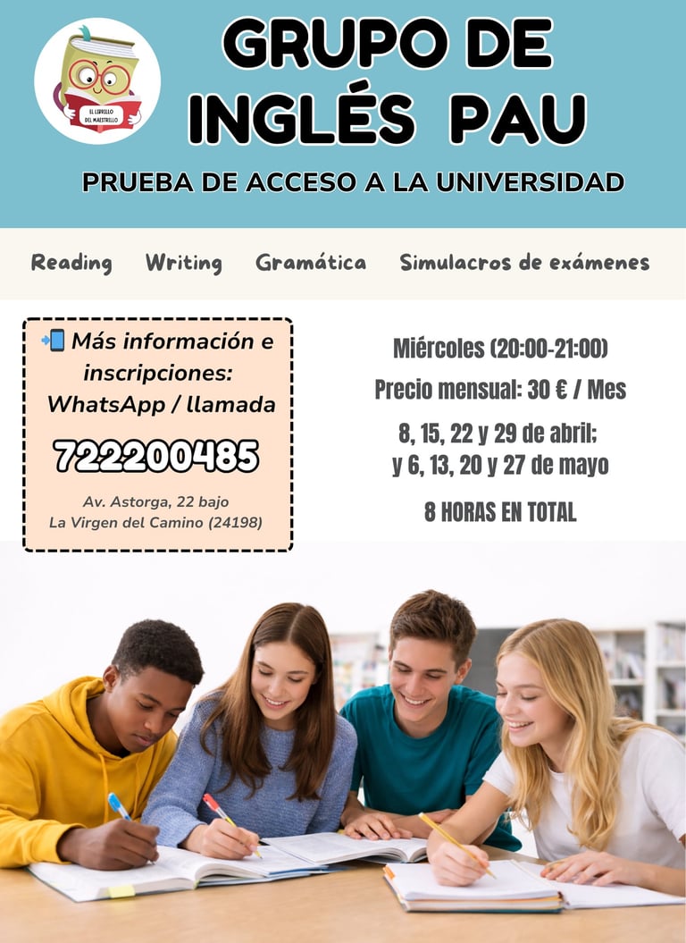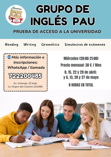 Si estás en 2º de Bachillerato y quieres afrontar el examen de inglés de la PAU (Selectividad) con seguridad, este curso está pensado para ti. Trabajaremos de forma específica el formato del examen, practicando reading, writing, gramática y estrategias de examen con modelos reales de convocatorias anteriores.
